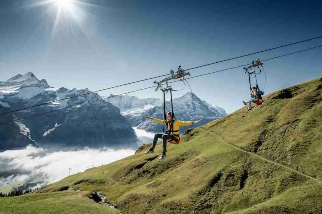 The last Day trip from Interlaken was dedicated to Grindelwald-First, an adventure hub with more than ten adventure activities under one roof. It is a famous mountain village with aesthetic views of the preserved unspoiled nature. Amidst this eye-pleasing panorama, I experienced some exciting hair-raising adventures, two of which were different variations of zip lining.